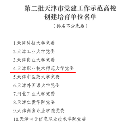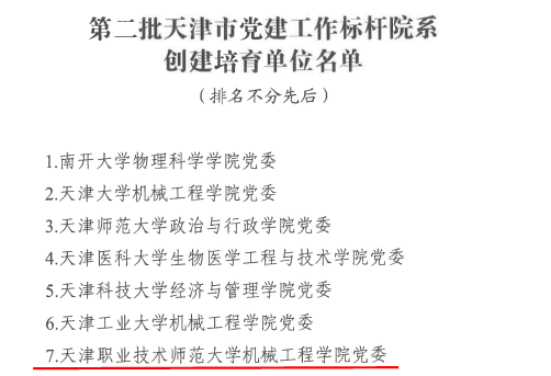 原网讯【通信员 刘短短】克日,市委教导工委市教委发布第两批新期间天津市下校党修“发航工程”创办培养单元实单,天津任务技能师范年夜教党委当选天津市党修任务树模下校制造培养单元,机器工程教院党委被选天津市党修任务标杆院系建树培养单元,机器工程教院机器制作教工党收部、艺术教院艺术取科技教工党收部考取天津市党修任务样品收部制造培养单元。
