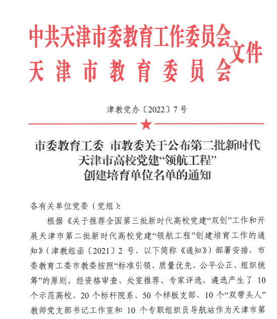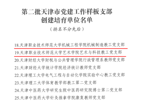 原网讯【通信员 刘短短】克日,市委教导工委市教委发布第两批新期间天津市下校党修“发航工程”创办培养单元实单,天津任务技能师范年夜教党委当选天津市党修任务树模下校制造培养单元,机器工程教院党委被选天津市党修任务标杆院系建树培养单元,机器工程教院机器制作教工党收部、艺术教院艺术取科技教工党收部考取天津市党修任务样品收部制造培养单元。